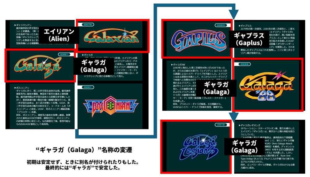 この時点では、現在一般に用いられる「ギャラガ」という名称は存在していなかった。