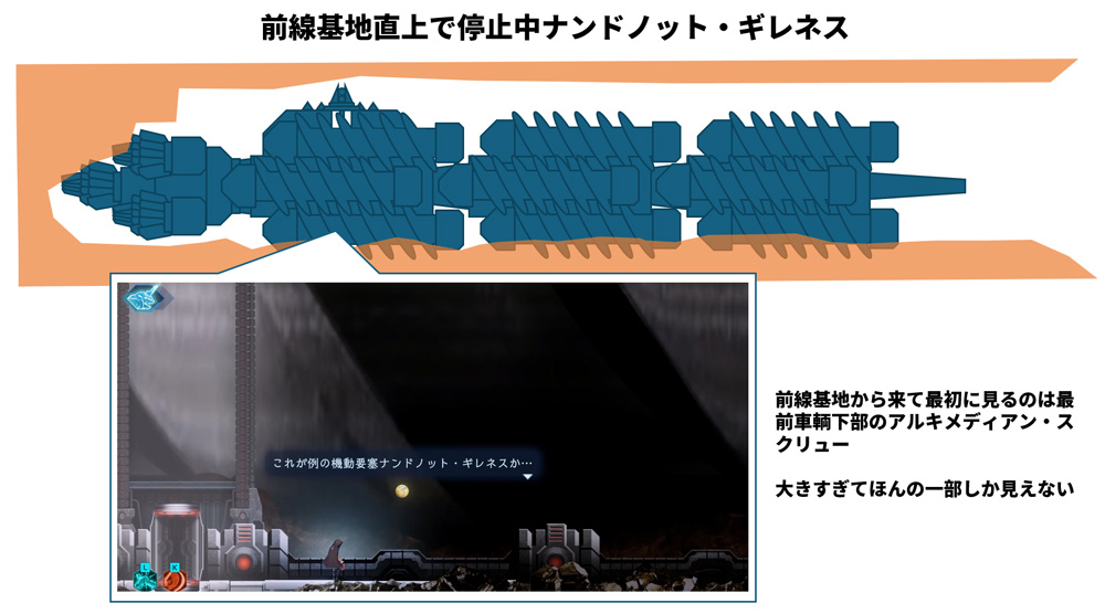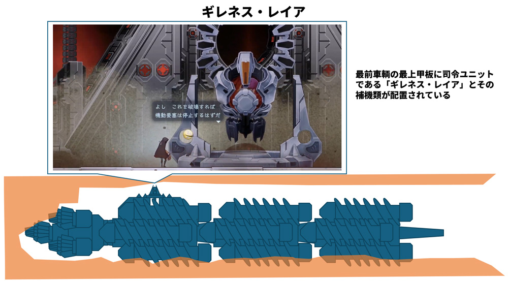 ゲーム中では、停止状態のナンドノット・ギレネス内部へ侵入することができる。