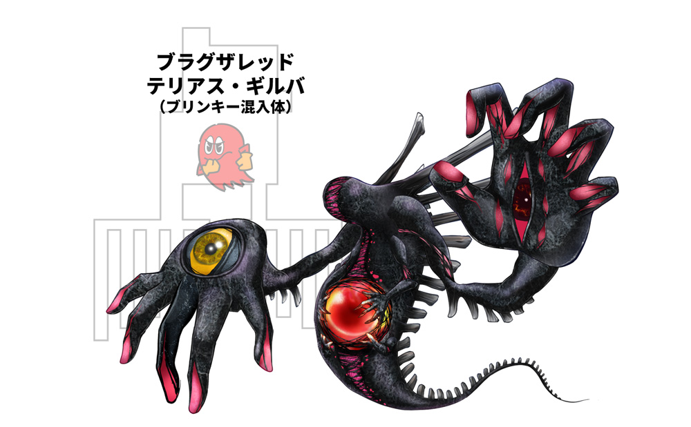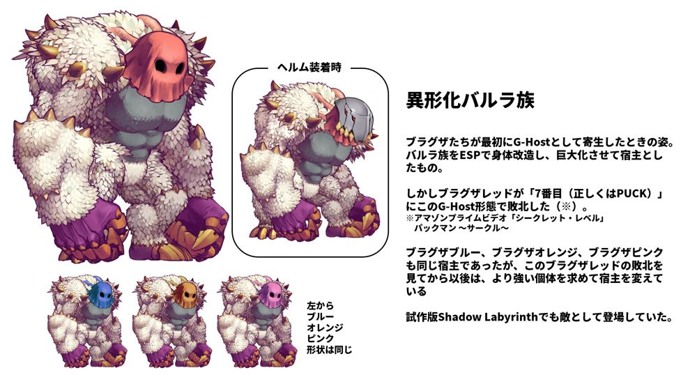 この事象についてはトリビア#63でも触れられているが、その際、立場と性格が最も近似していた『パックマン』のブリンキー(Blinky/Shadow/アカベイ)の思念がブラグザに混入した。