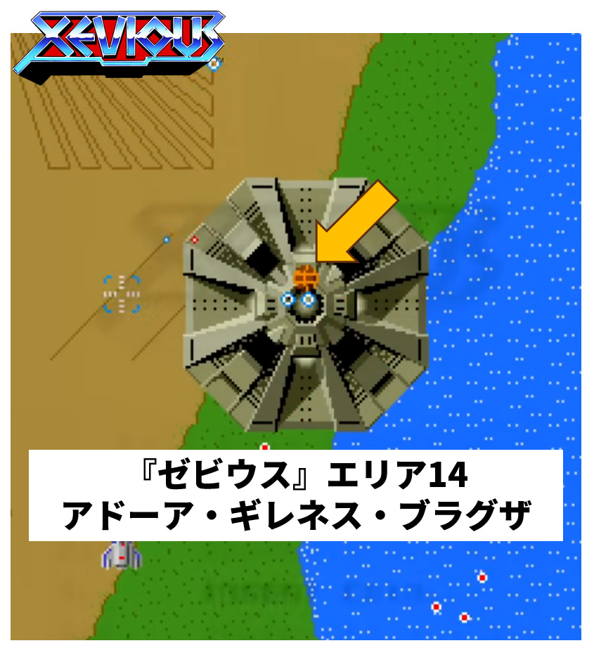 『ゼビウス』においては、エリア14後半に出現するアドーア・ギレネスのブラグザである。