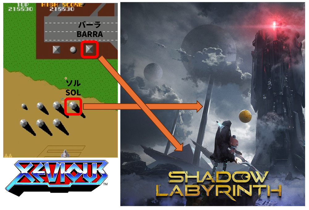 『Shadow Labyrinth』のキーアートにある巨大なピラミッドと八角柱は、それぞれ『ゼビウス』に登場した地上敵である。