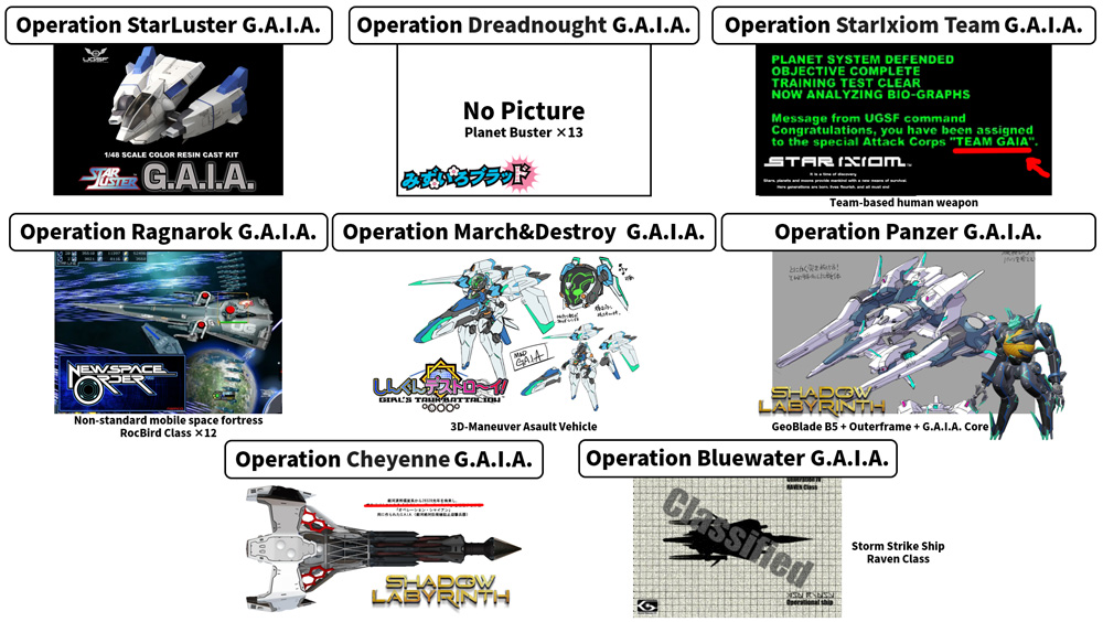 例えば、Operation Panzer G.A.I.A.を例に取ると、G.A.I.A.名は「Operation Panzer G.A.I.A.」だが、UGSFの兵器としての名称は「GeoBlade B5(B4)」。