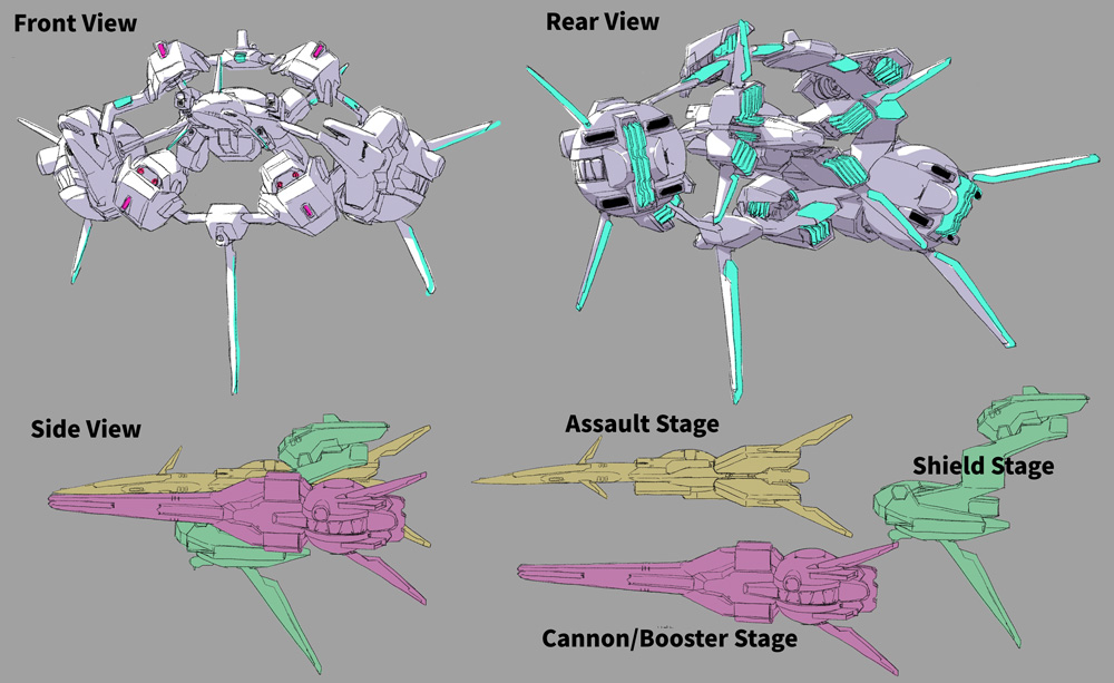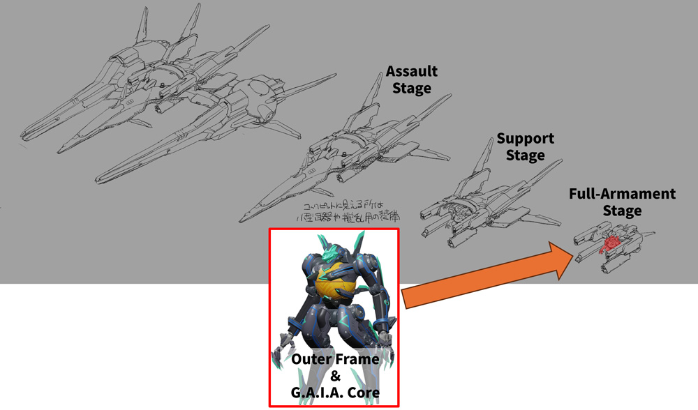 また本機はシールドステージ/火砲・ブースターステージ/アサルトステージ/サポートステージ/フルアーマーステージ/アウターフレーム/G.A.I.A.コアの6段から構成される。