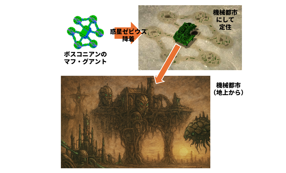 定住に当たっては、飛行不能となったマフ・グアントと、そこに残された各種科学技術、残ったボスコニアン・アンチマターを使い、迅速に機械化都市を建設。