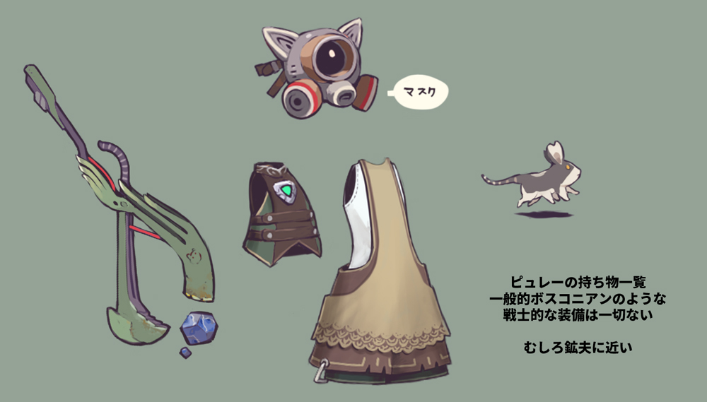 ボスコニアンは常に得意な武器を持つ習慣があるが、ピュレーだけは鉱物ハンマーやら鉱物拾い用の破砕プライヤーを持っている。